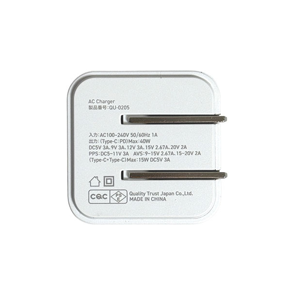 | 製品仕様 | 【出力ポート】Type-C×2 【定格入力】100-240V 50-60Hz 1A 【定格出力】 Type-C(PD):5V/3A、9V/3A、12V/3A、15V/2.67A、 20V/2A ※1 Type-C(PPS):5~11V/3A ※1 Type-C(AVS):9~15V2.67A、15~20V2A ※1 2ポート合計:最大5V/3A ※1 Type-Cポート単独使用時のみ対応 |