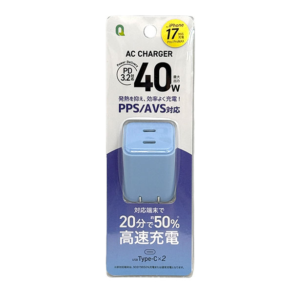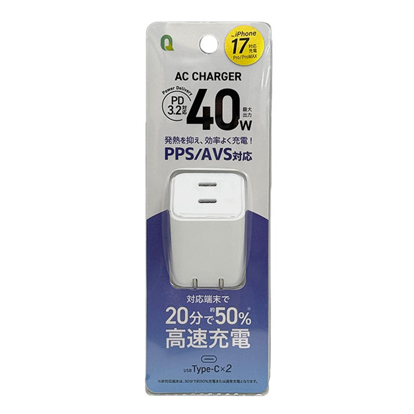 USB PD3.2対応 最大40W 2ポートAC充電器。